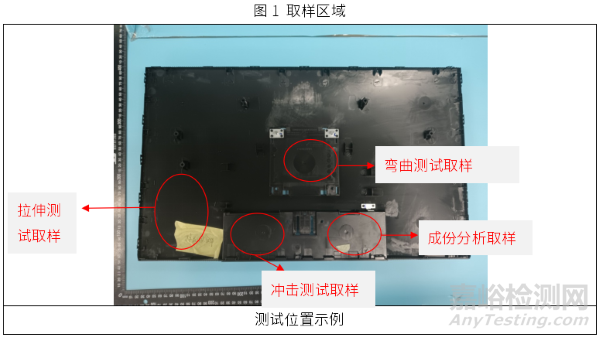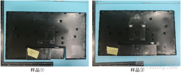 客戶外包生產(chǎn)的后蓋組裝后出現(xiàn)開裂情況,開裂原因?yàn)樗苣z外殼局部位置存在變形導(dǎo)致??蛻籼峁┱F?樣品①)和異常品(樣品②)委托實(shí)驗(yàn)室進(jìn)行比對(duì)分析,追溯異常翹曲的原因。