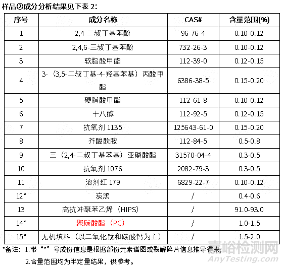 1.結(jié)果表明異常品存在一定含量的聚碳酸酯(PC)成份,正常品并未檢查這一成份,表明異常品存在一定的混料現(xiàn)象;