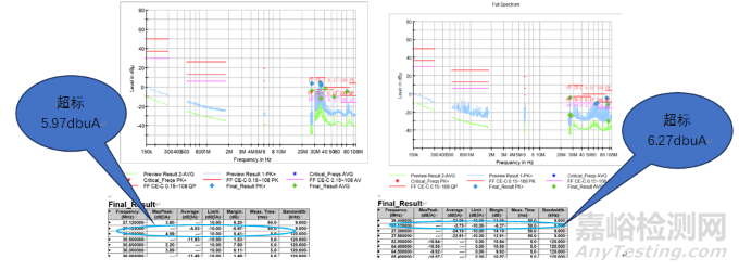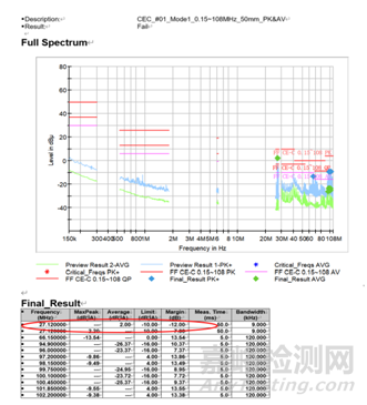 車載產(chǎn)品在進(jìn)行CCE測試時(shí),發(fā)現(xiàn)50mm和750mm處,27.12MHz測試超標(biāo)12db,如圖1所示: