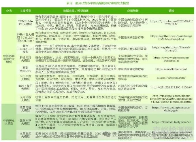 隨著NLP、BERT 和生成式預(yù)訓(xùn)練轉(zhuǎn)換器(generative pretrained transformer,GPT)等訓(xùn)練模型的快速發(fā)展,中醫(yī)藥領(lǐng)域正經(jīng)歷一場(chǎng)數(shù)字化和智能化的變革。中醫(yī)藥大模型作為代表,旨在整合和分析海量中醫(yī)藥文獻(xiàn)、中醫(yī)藥數(shù)據(jù)庫(kù)、臨床研究資料和醫(yī)案等數(shù)據(jù),通過(guò)訓(xùn)練大語(yǔ)言模型,將其應(yīng)用于中醫(yī)藥現(xiàn)代化的研發(fā)和輔助醫(yī)療中[95-96]。目前,中醫(yī)藥大模型主要包括中醫(yī)藥輔助診療大模型(如神農(nóng)中醫(yī)藥大模型、TCMLLM-PR 大模型、仲景中醫(yī)大模型等)和中藥研發(fā)大模型(如數(shù)智本草大模型、岐黃問(wèn)道大模型等)。部分已發(fā)布的中醫(yī)藥輔助診療和研發(fā)大模型,見(jiàn)表5。