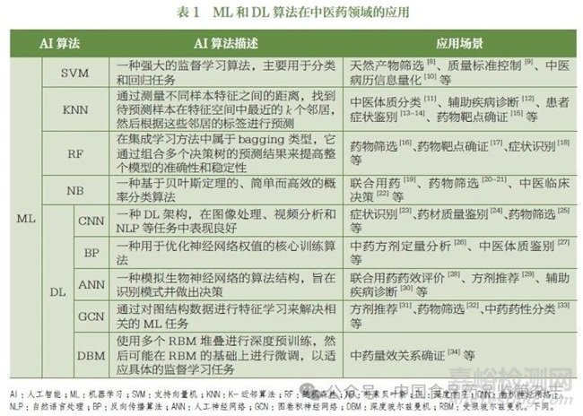 AI 在現(xiàn)代中藥數(shù)智化研發(fā)中可發(fā)揮關(guān)鍵作用, 相關(guān)技術(shù)包括機(jī)器學(xué)習(xí)(machine learning,ML)、深度學(xué)習(xí)(deep learning,DL)、自然語(yǔ)言處理(natural language processing,NLP)和知識(shí)圖譜(knowledge graph,KG) 等。AI 通過(guò)其強(qiáng)大的數(shù)據(jù)處理能力,可以實(shí)現(xiàn)對(duì)中醫(yī)藥海量數(shù)據(jù)的篩選、分析和歸納,以及古代醫(yī)家診治經(jīng)驗(yàn)與現(xiàn)代臨床數(shù)據(jù)的融合等[4-6] ;同時(shí),AI 的應(yīng)用能夠從復(fù)雜的數(shù)據(jù)中識(shí)別出有價(jià)值的信息,使中醫(yī)藥海量數(shù)據(jù)的結(jié)構(gòu)化和標(biāo)準(zhǔn)化成為可能,有利于揭示中藥復(fù)雜物質(zhì)基礎(chǔ)與作用機(jī)制、臨床療效之間的內(nèi)在聯(lián)系。因此,AI 的應(yīng)用極大地提高了數(shù)智中藥的研發(fā)效率和療效評(píng)估的精準(zhǔn)性,為中藥現(xiàn)代化轉(zhuǎn)型提供了技術(shù)支持[7]。AI 在中藥研發(fā)中的應(yīng)用場(chǎng)景主要包括方劑推薦、天然產(chǎn)物篩選、藥物靶點(diǎn)確證、藥材質(zhì)量標(biāo)準(zhǔn)控制和輔助診療等,見(jiàn)表1[8-34]。