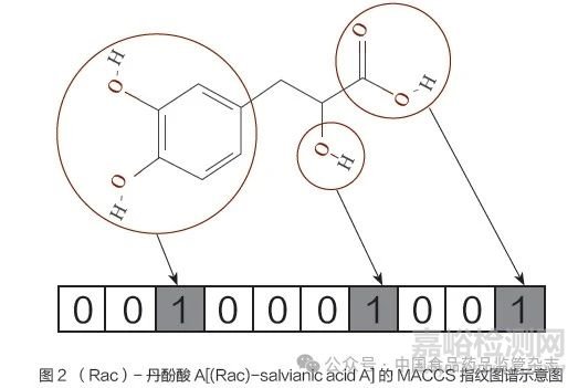 基于分子結(jié)構(gòu)的分子指紋(molecular fingerprints,MF)技術(shù)可以低計(jì)算成本的方式表示大規(guī)?;瘜W(xué)數(shù)據(jù)集中化合物的化學(xué)性質(zhì),將多種類(lèi)型的分子描述符轉(zhuǎn)化成計(jì)算機(jī)可讀格式,同時(shí)保持其固有的物理化學(xué)性質(zhì)[35]。MF 分為2D 指紋和3D 指紋。其中,大多數(shù)MF 的編碼方法僅使用2D 分子圖形信息,包括結(jié)構(gòu)鍵型指紋( 如MACCS)、子結(jié)構(gòu)指紋(如Daylight)和散列指紋(如ECFP)等;而3D 指紋主要是藥效團(tuán)指紋。MF 是一維的二進(jìn)制向量,其中每一個(gè)位點(diǎn)代表了分子中某一特定的結(jié)構(gòu)特征或?qū)傩缘挠袩o(wú)。例如,某一位點(diǎn)可能代表分子中是否含有苯環(huán),或者某個(gè)特定的官能團(tuán)是否存在,見(jiàn)圖2。目前MF 已被廣泛應(yīng)用于天然產(chǎn)物質(zhì)量標(biāo)準(zhǔn)化、藥物發(fā)現(xiàn)、靶點(diǎn)確證和藥物虛擬篩選等領(lǐng)域。