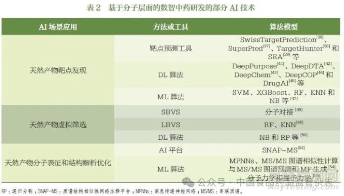 基于AI 算法對(duì)天然產(chǎn)物數(shù)據(jù)庫(kù)進(jìn)行篩選, 可以發(fā)現(xiàn)具有藥理活性的先導(dǎo)化合物, 主要方法包括基于結(jié)構(gòu)的虛擬篩選(structure-based virtual screening,SBVS) 和基于配體的虛擬篩選(ligand-based virtual screening,LBVS), 見(jiàn)表2。Deng 等[48] 結(jié)合SBVS、LBVS 和AI 算法(如RF、KNN)來(lái)驗(yàn)證分子對(duì)接結(jié)果,發(fā)現(xiàn)山楂和香蒲中含有的活性成分1,2- 二甲基苯和香蒲酸可能是神經(jīng)退行性疾病的有效抑制劑。Zhao 等[49]利用分子對(duì)接技術(shù),首次鑒定出2 種具有高抑制活性的PTP1B天然產(chǎn)物抑制劑黃芩苷和楊梅素,二者抑制活性均高于陽(yáng)性對(duì)照成分熊果酸,并通過(guò)動(dòng)物實(shí)驗(yàn)證實(shí)黃芩苷具有較好的降糖作用。此外,DL 算法通過(guò)分析大量的天然產(chǎn)物數(shù)據(jù)和生物活性數(shù)據(jù)、學(xué)習(xí)分子結(jié)構(gòu)與生物活性之間的關(guān)系,能夠預(yù)測(cè)新分子的活性和性質(zhì),從而篩選出潛在的藥物候選分子,提高篩選的準(zhǔn)確率。Zhang 等[50]利用NB 和遞歸分割(recursive partitioning,RP) 算法, 基于ECFP 和MACCS 分子指紋,構(gòu)建了52 個(gè)阿爾茲海默?。ˋlzheimer disease,AD) 相關(guān)靶標(biāo)的活性分子預(yù)測(cè)模型;通過(guò)對(duì)中國(guó)天然產(chǎn)物化學(xué)成分?jǐn)?shù)據(jù)庫(kù)(China Natural Products Chemical Composition Database,CNPC)、中藥系統(tǒng)藥理學(xué)數(shù)據(jù)庫(kù)與分析平臺(tái)(Traditional Chinese Medicine Systems Pharmacology Database and Analysis Platform,TCMSP) 數(shù)據(jù)庫(kù)中相關(guān)成分進(jìn)行篩選, 發(fā)現(xiàn)了12 種潛在的多靶點(diǎn)抗AD 化合物。Guo 等[51] 利用8999 個(gè)化合物的大規(guī)模數(shù)據(jù)集進(jìn)行預(yù)訓(xùn)練, 再基于938 種已知具有抗幽門(mén)螺桿菌活性的化合物進(jìn)行微調(diào),構(gòu)建了DL 模型并成功篩選出小檗堿衍生物8,通過(guò)化學(xué)蛋白質(zhì)組學(xué)結(jié)合液相色譜- 串聯(lián)質(zhì)譜(liquid chromatography mass spectrometry/mass spectrometry,LC-MS/MS)技術(shù)鑒定出SecA 和BamD 為小檗堿衍生物8 的直接作用靶點(diǎn),利用表面等離子體共振(surfaceplasmon resonance,SPR)和細(xì)胞熱轉(zhuǎn)變分析(cellular thermal shift assay,CESTA)驗(yàn)證了小檗堿衍生物8 與這兩個(gè)靶蛋白的特異性相互作用小,同時(shí)發(fā)現(xiàn)小檗堿衍生物8 具有較優(yōu)的抗菌活性和藥代動(dòng)力學(xué)特性,為抗幽門(mén)螺桿菌藥物開(kāi)發(fā)提供了新策略。