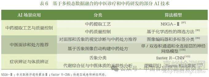 中醫(yī)藥多模態(tài)數(shù)據(jù)整合了來(lái)自不同層面的信息資源,具體涵蓋:豐富的文本資料(如中醫(yī)藥古籍、現(xiàn)代研究論文等)、視覺(jué)圖像數(shù)據(jù)(如舌診圖像、醫(yī)學(xué)影像等)、聲音記錄(如脈診分析音頻等),以及通過(guò)傳感器采集的病理生理參數(shù)。此外,該數(shù)據(jù)體系還包含化合物數(shù)據(jù)(用于中藥成分研究)、臨床數(shù)據(jù)(反映患者健康狀況和治療效果)、基因組和蛋白質(zhì)組信息(用于探索個(gè)體化治療差異)、代謝組和微生物組數(shù)據(jù)(揭示藥物作用機(jī)制),以及藥物相互作用信息、患者反饋數(shù)據(jù)、流行病學(xué)統(tǒng)計(jì)結(jié)果、政策法規(guī)文件和教育資源材料等?;诙嗄B(tài)數(shù)據(jù)的整合和分析,AI 在方劑提取流程和工藝優(yōu)化、疾病診斷輔助、方劑推薦和優(yōu)化等方面發(fā)揮著重要作用,見(jiàn)表6。