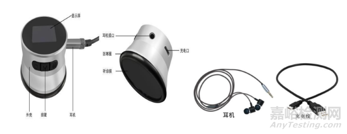 電子聽診器通常由主機、聽筒(耳機或耳環(huán)和傳聲連接導(dǎo)管組成)、USB 充電線/數(shù)據(jù)線(如有)、嵌入式軟件和/或APP 應(yīng)用軟件(如有)組成,其中主機可由聽診頭、拾音器、信號處理模塊、嵌入式軟件等組成。一般產(chǎn)品主機設(shè)計為一體式,聽診頭由圓形金屬頭、聽診膜組成,主機腔內(nèi)設(shè)拾音傳感器、信號處理模塊、電池,顯示屏、USB 充電口及各功能按鍵。