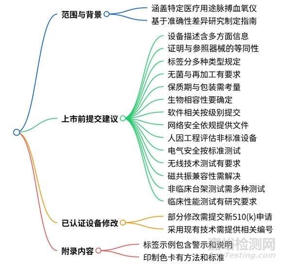 對(duì)不同類型(處方/非處方/已獲510(k)認(rèn)證)脈搏血氧儀,在標(biāo)簽內(nèi)容等方面有不同要求,并對(duì)各類測(cè)試及研究(非臨床臺(tái)架測(cè)試、臨床性能測(cè)試等)作詳細(xì)建議。該指南草案主要內(nèi)容梳理為以下思維導(dǎo)圖: