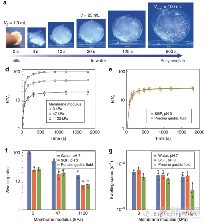 圖3 PVA水凝膠的溶脹性能探究(溶脹直觀變化圖及不同模量水凝膠、在不同溶液介質(zhì)中的溶脹行為研究)
