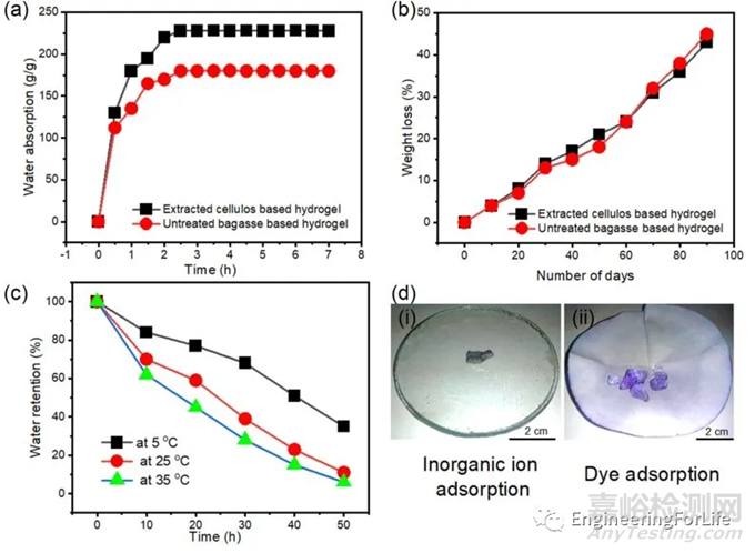 圖4 a.甘蔗渣基水凝膠的吸水率探究;b.水凝膠的降解性能;c.水凝膠在不同溫度下(5/25/35 ℃)的保水特性;d.水凝膠對(duì)重金屬離子及顏料的吸附性