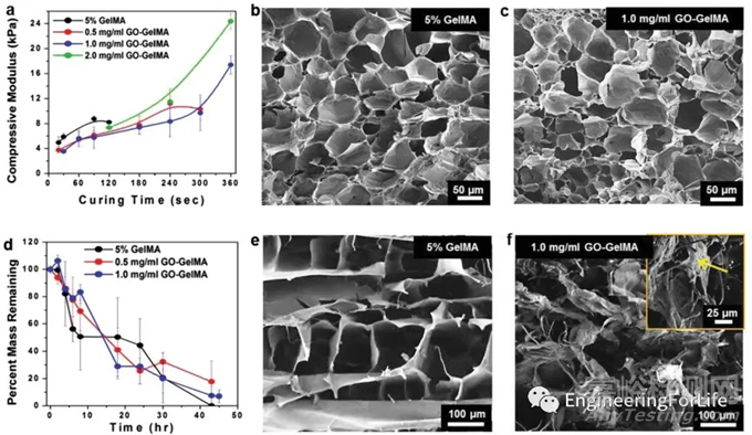 圖5 GelMA/GO復(fù)合水凝膠的降解行為:a.水凝膠壓縮模量隨GO濃度和光固化時(shí)間的變化曲線 b/c. GelMA/GO水凝膠的SEM圖; d.不同GO濃度的水凝膠暴露于膠原酶的降解情況;e/f.膠原酶作用24小時(shí)后,GelMA/GO水凝膠的SEM圖