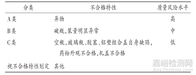 根據不合格對產品質量的影響,將不合格品劃分為 3 類,詳見表1。1)A 類含有不少于 1 個 A 類不合格,或含有 B 類、C 類不合格產品。該類不合格品可能會導致使用者遭受生命危險或醫(yī)療風險事件,是不可接受的,風險高。如凍干粉針劑的異物纖維、色塊、玻璃碎片等。2)B 類含有不少于 1 個 B 類不合格,或含有 C 類不合格,但不含有 A類不合格產品。該類不合格品可能會導致使用者發(fā)生醫(yī)療風險事件,但易被使用者發(fā)現(xiàn),風險中等。如凍干粉針劑存在破瓶(瓶底邊緣裂紋或缺口、掉底、瓶頸處裂紋、瓶身裂紋)和裝量明顯異常(裝量明顯偏高或明顯偏低)等情況。3)C 類含有不少于 1個 C 類不合格,但不含有 A 類、B 類不合格產品。正常使用時該類不合格品不會導致使用者發(fā)生任何明顯的風險事件,主要是產品的外觀缺陷,風險低。如凍干粉針劑存在空瓶,玻璃瓶、膠塞、鋁塑組合蓋自身缺陷;藥粉外觀不合格(粉餅萎縮、粉餅形狀異常),膠塞上有不易脫落的凍結藥粉;軋蓋外觀不合格(軋蓋不合格導致鋁塑組合蓋未完全包裹瓶口、鋁蓋包邊不平整)等情況。