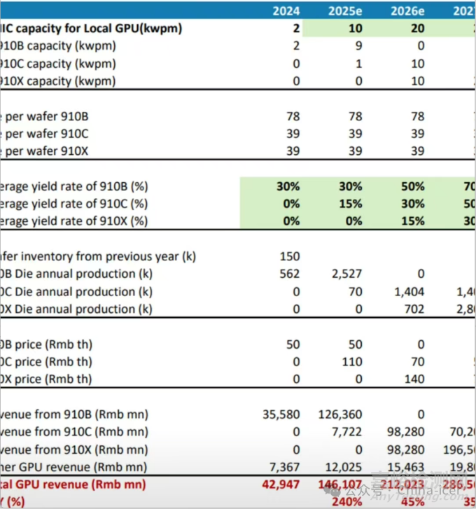 • 產(chǎn)能規(guī)劃:2025年Q2開始量產(chǎn),首批出貨量達(dá)到7萬顆,全年目標(biāo)出貨量為80萬顆。2026年將推出支持FP8的910D版本
