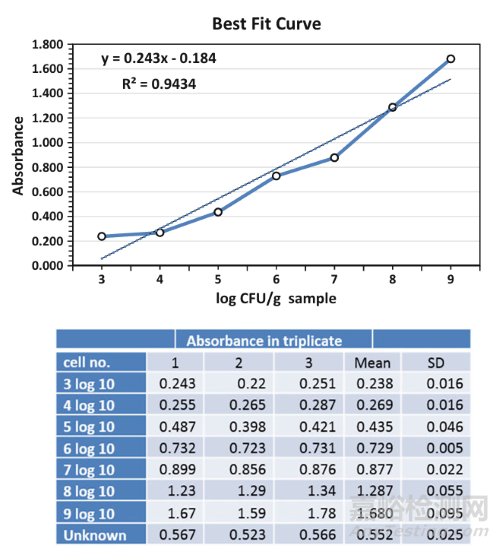3. 對(duì)于實(shí)驗(yàn)中獲得的吸光度值,從y軸該數(shù)值點(diǎn)作一條水平線延伸至最佳擬合曲線,在交點(diǎn)處作x軸的垂直線,得到x軸上的值(圖1)。