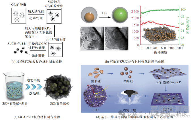 業(yè)內有報道顯示:將Si 納米顆粒(SiNP)通過丙烯腈乳液聚合,再經過熱解工藝制備了具有核殼結構的Si/C 復合材料(Si@C),無定形碳殼層阻止了 SiNP 在充放電循環(huán)過程中的團聚,進而提高了電極的循環(huán)性能 (圖2(a))。