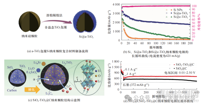 例如:二氧化鈦(TiO2)作為包覆層表現(xiàn)出非常優(yōu)異的性能,其鋰化時的體積變化可以忽略,作為物理界面層,具有優(yōu)異的熱穩(wěn)定性,并能安全存儲鋰。