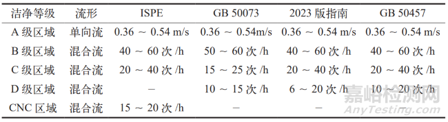 首先,讓我們審視一下標(biāo)準(zhǔn)和指南中對(duì)潔凈區(qū)域換氣次數(shù)的要求,隨后深入探討送風(fēng)量。表 1 列舉了不同標(biāo)準(zhǔn)和指南對(duì)藥廠不同等級(jí)區(qū)域換氣次數(shù)的要求。從表 1 中可以看出,除了 A 級(jí)區(qū)域外,其他等級(jí)區(qū)域的換氣次數(shù)數(shù)據(jù)存在顯著差異,這表明換氣次數(shù)的要求并不嚴(yán)格。