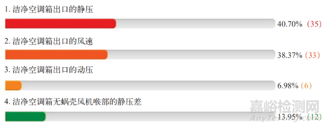 區(qū)域內(nèi)房間的換氣次數(shù)由潔凈空調(diào)箱的變頻風(fēng)機(jī)和末端風(fēng)閥調(diào)節(jié)實(shí)現(xiàn)。對(duì)于一個(gè)固定的換氣次數(shù),我們希望空調(diào)箱提供恒定的送風(fēng)量。我們收集了市場(chǎng)上空調(diào)箱變頻送風(fēng)的控制方法,并歸納為:空調(diào)箱出口靜壓控、空調(diào)箱出口風(fēng)速控、空調(diào)箱出口動(dòng)壓控和風(fēng)機(jī)喉部靜壓差控這 4 種控制方式。通過(guò)網(wǎng)絡(luò)調(diào)研,我們了解了這些控制方法的占比情況。