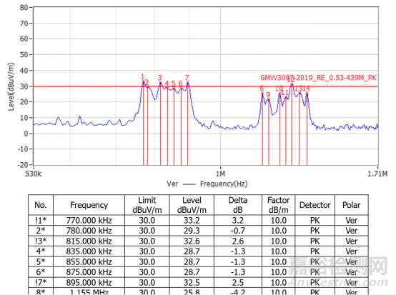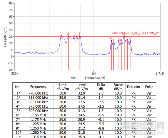 在頻率范圍為530KHz-1.7MHz,掃描頻率9KHz,發(fā)現(xiàn)兩段寬帶超標(biāo),如下圖黃色區(qū)域所示: