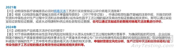 醫(yī)療器械病毒滅活驗(yàn)證是確保產(chǎn)品安全、滿(mǎn)足法規(guī)要求的關(guān)鍵步驟,但其復(fù)雜性也常常成為產(chǎn)品快速獲批的“攔路虎”。從CMDE共識(shí)問(wèn)題回答可以了解,監(jiān)管機(jī)構(gòu)對(duì)于動(dòng)物源性或同種異體醫(yī)療器械是否需進(jìn)行病毒滅活研究的要求是日漸趨嚴(yán)。2021年,監(jiān)管機(jī)構(gòu)的回復(fù)中說(shuō)明可以通過(guò)文獻(xiàn)或歷史數(shù)據(jù)對(duì)病毒滅活效果進(jìn)行評(píng)價(jià),對(duì)額外的病毒滅活驗(yàn)證沒(méi)有硬性要求,但2024年的回復(fù)中明確表明需要提交病毒滅活研究的相關(guān)材料。具體答復(fù)見(jiàn)圖1。同時(shí)FDA明確要求動(dòng)物源性醫(yī)療器械需提交相關(guān)申報(bào)注冊(cè)資料。由于病毒滅活驗(yàn)證可以從根源上防止病毒通過(guò)醫(yī)療器械傳播,是醫(yī)療器械安全性的基石,因此CMDE和FDA等國(guó)內(nèi)外監(jiān)管機(jī)構(gòu)對(duì)上述類(lèi)別醫(yī)療器械的病毒滅活/去除驗(yàn)證有明確規(guī)定,如申報(bào)過(guò)程提交的資料病毒污染風(fēng)險(xiǎn)評(píng)估不足、滅活驗(yàn)證方案不合理或驗(yàn)證數(shù)據(jù)不符合要求,將直接導(dǎo)致注冊(cè)申請(qǐng)被駁回、要求補(bǔ)充資料甚至面臨召回風(fēng)險(xiǎn)。