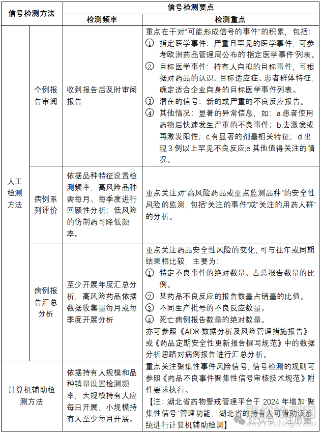 其他的信號(hào)檢測(cè)方法還包括:經(jīng)營(yíng)使用單位退藥、患者投訴、媒體關(guān)注事件、藥品安全性研究、監(jiān)管部門(mén)發(fā)布的藥品安全信息等,持有人可根據(jù)品種特征設(shè)置檢測(cè)頻率和范圍。