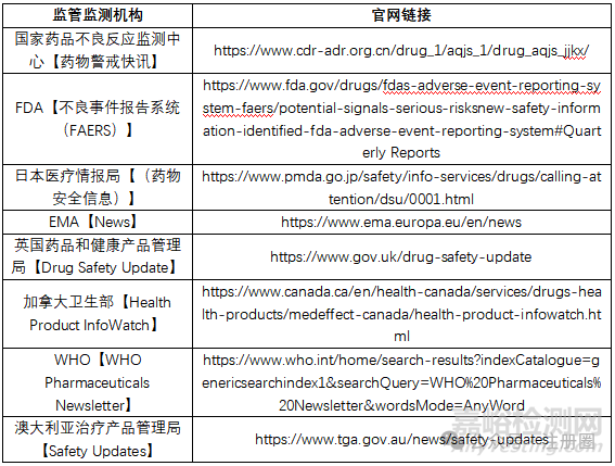 對(duì)于新藥/創(chuàng)新藥的信號(hào)評(píng)價(jià),臨床研究和非臨床研究、文獻(xiàn)報(bào)道尤其關(guān)鍵;對(duì)于仿制藥信號(hào)評(píng)價(jià),“國(guó)內(nèi)外監(jiān)管監(jiān)測(cè)機(jī)構(gòu)發(fā)布的藥品安全警示信息”是重要的證據(jù)來(lái)源。下表列舉了主要的國(guó)內(nèi)外監(jiān)管機(jī)構(gòu)的安全警示信息來(lái)源: