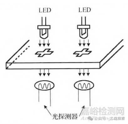 圖2 二極管在掩模版的預(yù)對(duì)準(zhǔn)標(biāo)識(shí)上方照明,光線透過(guò)對(duì)準(zhǔn)標(biāo)識(shí),被探測(cè)器接受;每個(gè)探測(cè)器分為對(duì)稱的四個(gè)區(qū)域,可以分別探測(cè)光信號(hào)并判斷出標(biāo)識(shí)偏離的相對(duì)位置
