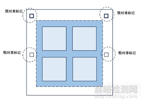 而整場(chǎng)對(duì)準(zhǔn)標(biāo)識(shí)是在第一次曝光時(shí)被刻在wafer左右兩邊用于每個(gè)硅片粗對(duì)準(zhǔn)的,粗對(duì)準(zhǔn)就是在預(yù)對(duì)準(zhǔn)的基礎(chǔ)之上進(jìn)一步對(duì)準(zhǔn)掩模版和wafer。這里需要強(qiáng)調(diào)的是,粗對(duì)準(zhǔn)標(biāo)記不在shot中而是在整個(gè)wafer的兩邊,后面要提到的精對(duì)準(zhǔn)標(biāo)識(shí)是在每個(gè)shot內(nèi)部都有。下圖3是預(yù)對(duì)準(zhǔn)標(biāo)記和粗對(duì)準(zhǔn)標(biāo)記在mask上的位置。