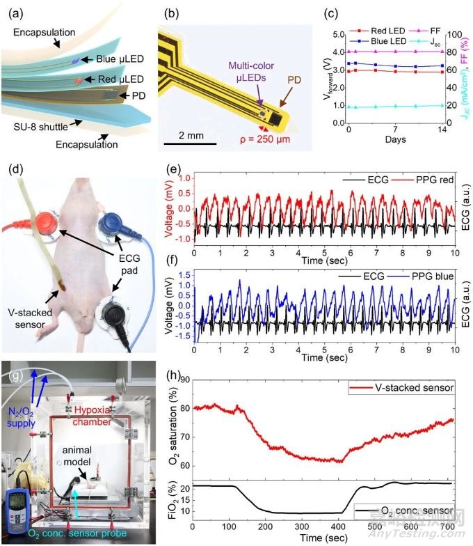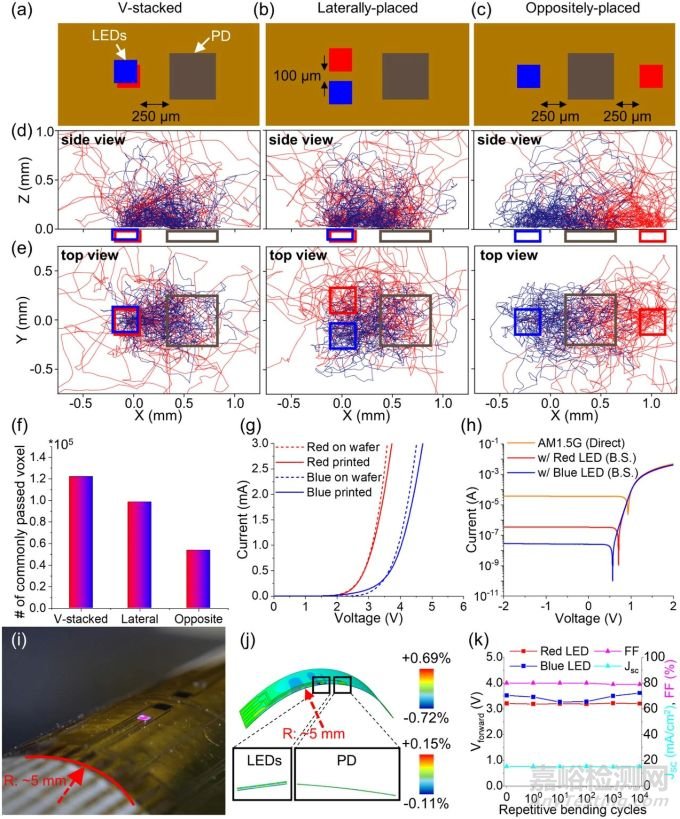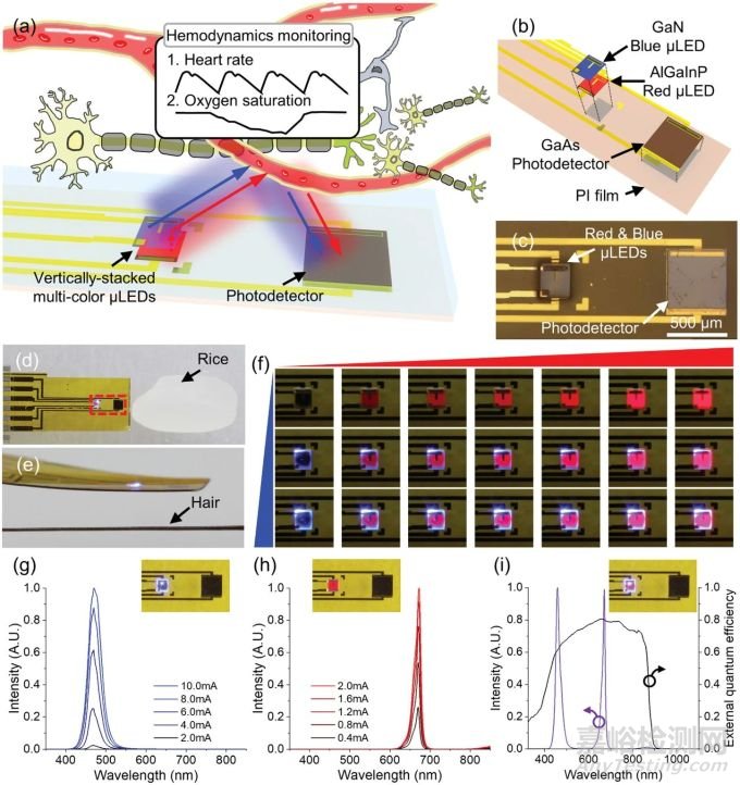 兩個(gè)LED的擺放方式不同于傳統(tǒng)的平行放置和對(duì)稱(chēng)放置,而是采取了垂直堆疊放置,俯視時(shí)就像一個(gè)LED,有效減少了電路尺寸。圖2-d、e顯示了傳感器的光學(xué)圖像,用于與米粒和人的頭發(fā)尺寸進(jìn)行比較。其中紅色 LED 厚度:4.1 µm,藍(lán)色 LED 厚度:5.0 µm,兩個(gè) LED 尺寸:250 × 300 µm2。