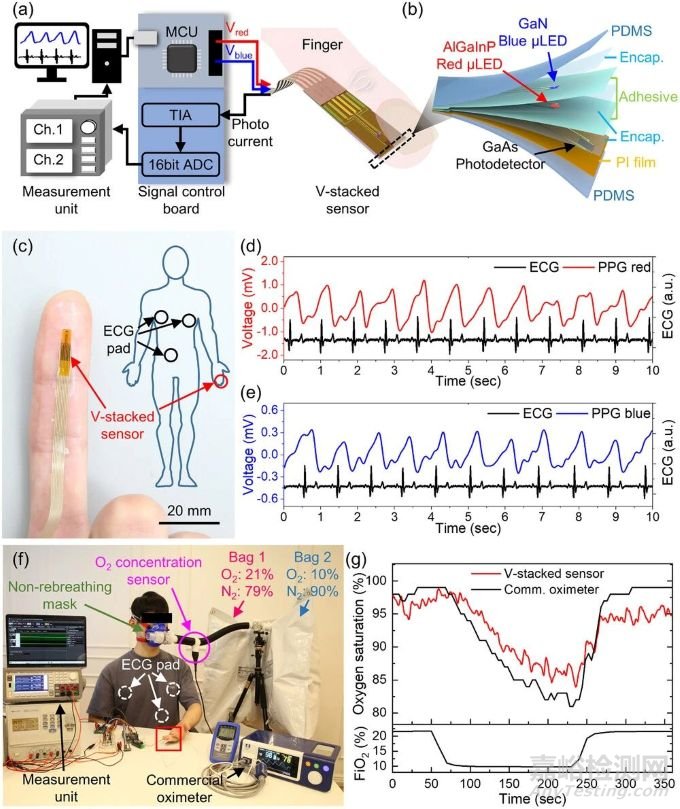 圖3-d、e顯示了 V 型堆疊傳感器測(cè)得的光電容積描記法 (PPG) 信號(hào),包括紅光和藍(lán)光兩個(gè)波長(zhǎng)的數(shù)據(jù)。計(jì)算得到的心率與來(lái)自 ECG 傳感器的心率完全匹配。