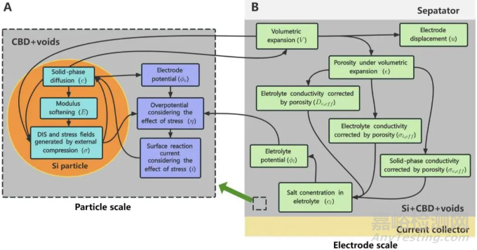 電池內(nèi)硅的鋰化過(guò)程呈現(xiàn)出復(fù)雜的多尺度和多場(chǎng)耦合關(guān)系。在顆粒尺度上(如圖 1(A) 所示),硅顆粒的鋰化過(guò)程會(huì)導(dǎo)致材料軟化和顯著的體積膨脹。這種膨脹受到周圍CBD和硅顆粒的限制,從而在硅顆粒上形成隨濃度和模量變化的應(yīng)力場(chǎng)。這種應(yīng)力包括擴(kuò)散誘導(dǎo)應(yīng)力(DIS)和顆粒之間相互作用產(chǎn)生的應(yīng)力。硅顆粒表面的應(yīng)力場(chǎng)會(huì)影響表面反應(yīng)電流,而內(nèi)部應(yīng)力場(chǎng)則會(huì)影響固相中的鋰離子擴(kuò)散系數(shù),兩者反過(guò)來(lái)又會(huì)影響固相中的濃度分布。在電極尺度上(如圖 1(B) 所示),硅顆粒的體積膨脹會(huì)改變活性電極的孔隙率,影響鋰離子在電解質(zhì)中的擴(kuò)散速率、電解質(zhì)電導(dǎo)率和固相電導(dǎo)率,從而影響活性電極內(nèi)電解質(zhì)鹽的濃度分布。電解質(zhì)鹽的濃度分布則會(huì)影響電池電位,而固相的平衡電位也會(huì)影響電池電位,并且它隨硅顆粒中鋰濃度的變化而變化。電池電位的變化會(huì)影響活性顆粒表面的過(guò)電位,從而影響硅顆粒表面的反應(yīng)電流,最終影響硅顆粒上的濃度分布。此外,硅粒子的體積膨脹會(huì)引起活性電極的巨大體積變形,導(dǎo)致電極尺度的機(jī)械不穩(wěn)定性,進(jìn)而影響電極的鋰化狀態(tài)。從上述分析中可以看出,電池內(nèi)的耦合場(chǎng)是圍繞硅顆粒中的鋰離子濃度建立的,而鋰化導(dǎo)致的膨脹是連接濃度、應(yīng)力和孔隙率的關(guān)鍵因素?;谏鲜鲴詈详P(guān)系,本工作建立了多尺度多物理場(chǎng)的硅電極分析模型。