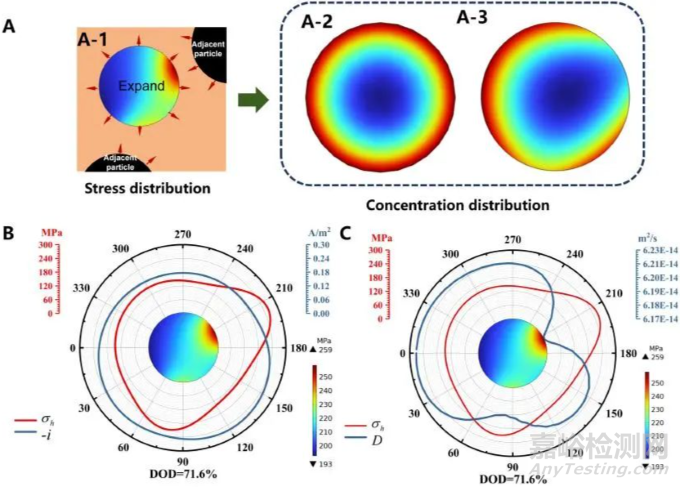 在電極中,遷移到活性顆粒表面的鋰離子發(fā)生電化學(xué)反應(yīng)并嵌入其中。僅考慮擴(kuò)散時(shí),鋰在顆粒內(nèi)的分布形成同心圓形梯度,如圖2(A-2)所示。實(shí)際上,由于顆粒之間的壓縮,產(chǎn)生的應(yīng)力改變了活性顆粒的擴(kuò)散系數(shù)與活性顆粒表面的電化學(xué)反應(yīng)(如圖2(B和C)),使鋰離子在顆粒內(nèi)的分布變得不均勻,如圖2(A-3)所示。這是因?yàn)閼?yīng)力改變了擴(kuò)散的化學(xué)勢(shì)和活性顆粒表面反應(yīng)的自由能。