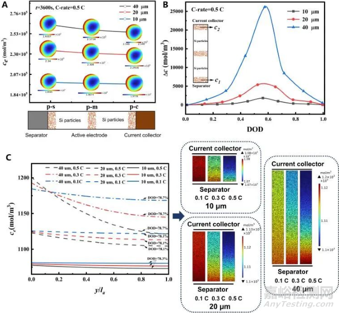 對(duì)不同厚度的電極上靠近隔膜側(cè)、電極中間位置、靠近集流體側(cè)的三個(gè)位置的代表性顆粒的分析得出,越厚電極上靠近隔膜側(cè)和靠近集流體側(cè)的活性顆粒上的濃度差別越大。電解液中電解質(zhì)鹽的分布情況(圖3(C),)可以看出,越厚電極上的電解質(zhì)鹽濃度的分布越不均勻,在較小厚度下倍率對(duì)電解質(zhì)鹽濃度的分布影響較小,只有在較厚度電極上倍率對(duì)電解質(zhì)鹽濃度分布的影響才逐漸明顯。這是因?yàn)楦竦碾姌O有更長(zhǎng)的離子遷移路徑,短時(shí)間內(nèi)鋰離子無(wú)法遷移到集流體側(cè),造成厚度方向上電解質(zhì)鹽的分布不均勻。另外,硅顆粒的體積膨脹改變了電極上的孔隙率,使得電解液中的離子遷移變得更加困難。