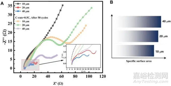 對(duì)電極循環(huán)前后的EIS實(shí)驗(yàn)發(fā)現(xiàn),歐姆阻抗和電荷轉(zhuǎn)移阻抗隨著循環(huán)進(jìn)行在增大,這是因?yàn)榧黧w和活性電極連接界面的失效和活性顆粒表面SEI層的生成。另外,歐姆阻抗隨電極厚度的增加在增大,但是實(shí)驗(yàn)結(jié)果中出現(xiàn)了與直觀感覺(jué)相反的現(xiàn)象,越厚電極的電荷轉(zhuǎn)移阻抗(奈奎斯圖中的第二個(gè)半圓)越小,出現(xiàn)這種現(xiàn)象的原因是厚電極上活性顆粒的比表面較大,為鋰離子在表面的電化學(xué)反應(yīng)提供更多的空間。