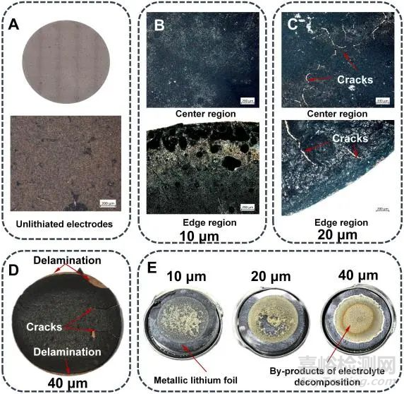 電極表面形貌的光學(xué)顯微鏡(OM)圖分析得出,隨著電極厚度增加,電極出現(xiàn)明顯的界面脫層和表面裂紋,這是與均質(zhì)化模型分析得到的結(jié)果分析結(jié)論一致。在拆解鋰片表面,電極越厚電解液的復(fù)分解產(chǎn)物越多,這是因?yàn)檩^厚電極具有較高的電流密度而產(chǎn)生更多的熱量,從而導(dǎo)致局部電解液失效。