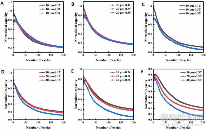 硅基紐扣半電池充放電循環(huán)的實(shí)驗(yàn)結(jié)果顯示,同厚度下倍率變化對(duì)容量保持率的影響較小。相反,同倍率下厚度的變化對(duì)容量保持率影響較大,并且隨著倍率的升高這種影響越明顯。這與建模分析的結(jié)果一致,相對(duì)而言,容量保持對(duì)倍率變化的敏感度較低,但對(duì)電極厚度變化的敏感度較高。造成以上結(jié)果主要原因是厚的活性電極具有更長(zhǎng)的離子遷移路徑和機(jī)械不穩(wěn)定的內(nèi)部結(jié)構(gòu)。