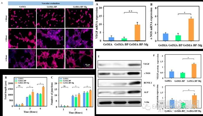 研究人員利用金屬離子的配位反應(yīng)構(gòu)建了一種含有Mg2+的可注射水凝膠微球。為了研究水凝膠微球釋放的Mg2+對(duì)血管化的影響,研究人員選擇人臍靜脈血管內(nèi)皮細(xì)胞(HUVEC)作為模式細(xì)胞,將其分別與GelMA組、GelMA-BP組、GelMA-BP-Mg組這三組復(fù)合水凝膠微球的提取液進(jìn)行共培養(yǎng);對(duì)于這種可釋放金屬離子的水凝膠微球,研究人員選擇了哪些具體實(shí)驗(yàn)來(lái)對(duì)促血管功能加以驗(yàn)證?