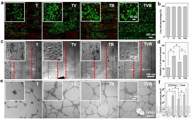 (3)體外血管生成實(shí)驗(yàn)結(jié)果顯示,與空白組T支架相比,TV、TB和TVB提取物促進(jìn)血管生成的環(huán)和血管網(wǎng)節(jié)點(diǎn)數(shù)量多,說(shuō)明了AP的快速釋放是加速大鼠內(nèi)皮細(xì)胞(EC)促進(jìn)EC管的形成,由此促進(jìn)血管的生成。