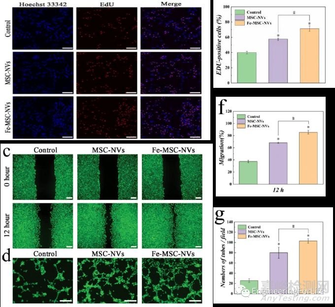 研究人員制備了一種雙功能微針貼片,該微針針尖內(nèi)核部分含有鐵-間充質(zhì)干細(xì)胞來(lái)源的人工納米囊(Fe-MSC-NVs)。為了驗(yàn)證該微針Fe-MSC-NVs部分是否可以促進(jìn)血管生成,研究人員選擇人臍靜脈血管內(nèi)皮細(xì)胞(HUVECs)作為模式細(xì)胞,將其分別與PBS對(duì)照組、MSC-NVs組、Fe-MSC-NVs組三組材料進(jìn)行共培養(yǎng)實(shí)驗(yàn);對(duì)于這種多功能的微針貼片,研究人員對(duì)其血管生成功能的驗(yàn)證實(shí)驗(yàn)該如何設(shè)計(jì)?