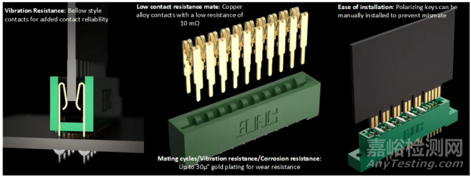 圖 2.卡邊緣連接器采用波紋管式觸頭,具有抗振性,銅合金觸頭具有低電阻,鍍金具有耐磨性。