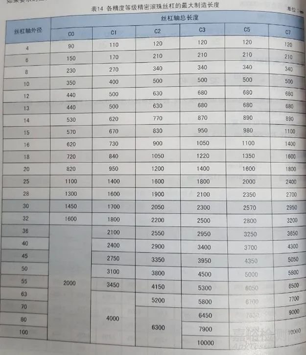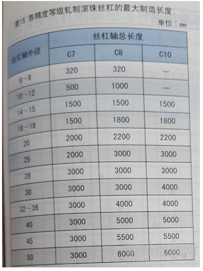 還有一個需要充分注意的地方,就是絲桿的隨著直徑的變化,其是有相應(yīng)的制造長度的。如果太長的話,一個是絲桿會因為剛性不足而產(chǎn)生彎曲變形,還有精度上也存在加工不足的問題。具體的選型可以參考一下這個參數(shù)表(根據(jù)不同廠家,能達到的精度不同,具體請參考你選用品牌的相關(guān)表格數(shù)據(jù))。