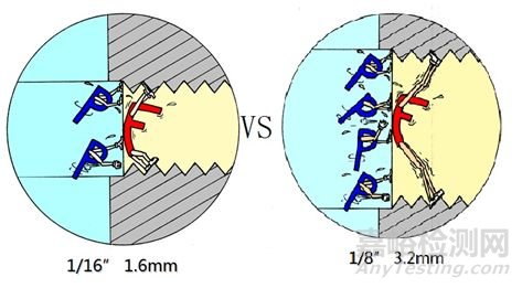 在滿足法蘭粗糙度和不平度條件時(shí),盡可能的選擇薄的墊片。墊片的厚度與其型式、材料、直徑、密封面的加工狀況和密封介質(zhì)等相關(guān)。對(duì)于大多數(shù)非金屬板材墊片而言,薄的墊片抵抗應(yīng)力松弛的能力也比較大。因薄的墊片其內(nèi)側(cè)跟介質(zhì)接觸的面積也小,所以沿墊片本體滲漏也隨之減少,并且此情況下墊片所承受的吹出力也小,墊片也就不容易被吹出,圖9形象的展示了薄墊片的抗吹出能力要比厚墊片強(qiáng)。當(dāng)然也可以參考?jí)|片標(biāo)準(zhǔn)選擇墊片厚度以及其它尺寸。