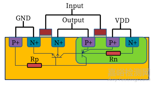 閂鎖效應(yīng)是指在CMOS集成電路中寄生的PNP和NPN雙極型晶體管相互影響而產(chǎn)生的一種低阻抗通路,從而產(chǎn)生大電流。由于正反饋作用,該狀態(tài)會被持續(xù)維持(即“閂鎖”),從而導(dǎo)致集成電路失效,嚴重時可能造成器件燒毀。