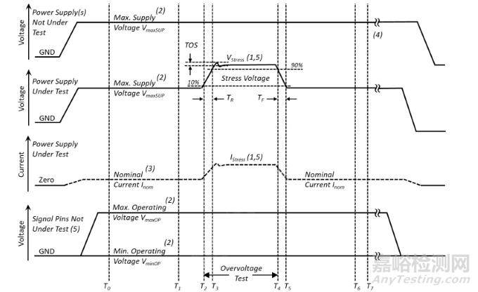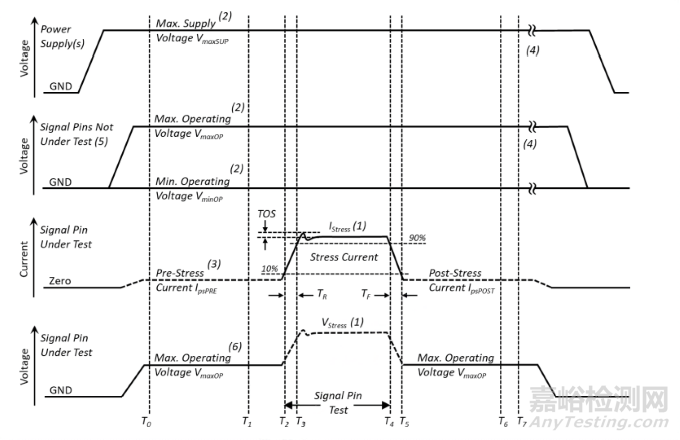 閂鎖測試實際是通過電流脈沖激勵于非電源(輸入、輸出、輸入/輸出等)管腳或者施加過電壓脈沖于電源管腳來評估芯片抗閂鎖效應(yīng)的能力,即過電壓測試V-test及過流測試I-test。