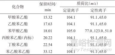 混合標(biāo)準(zhǔn)儲(chǔ)備液:準(zhǔn)確稱取苯甲酸乙酯、甲酸苯乙酯、乙酸苯乙酯、丁酸苯乙酯和苯乙酸苯乙酯各0.1 g,用萃取溶液溶解并定容于1 000 mL容量瓶中,配制成5種化合物的質(zhì)量濃度均為100 μg/mL的混合標(biāo)準(zhǔn)儲(chǔ)備液。
