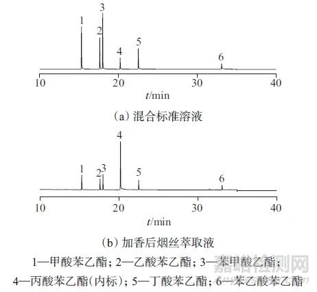 圖1混合標(biāo)準(zhǔn)溶液和加香后煙絲萃取液色譜圖