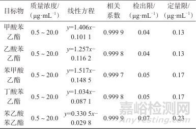 系列混合標(biāo)準(zhǔn)工作溶液:準(zhǔn)確移取0.25、0.50、2.50、5.0、10.0 mL混合標(biāo)準(zhǔn)儲(chǔ)備液,用萃取溶液分別定容于50 mL容量瓶中,配制成苯甲酸乙酯、甲酸苯乙酯、乙酸苯乙酯、丁酸苯乙酯和苯乙酸苯乙酯的質(zhì)量濃度均分別為0.5、1.0、5.0、10.0、20.0 μg/mL的系列混合標(biāo)準(zhǔn)工作溶液。