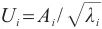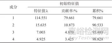 根據(jù)數(shù)理統(tǒng)計(jì)相關(guān)知識(shí),主成分分析的變換矩陣即主成分載荷矩陣(U)與因子載荷矩陣(A)及特征值(λ)的數(shù)學(xué)關(guān)系如式(1)所示。由式(1)計(jì)算得到主成分載荷矩陣見表8。