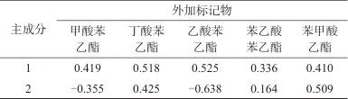 將得到的主成分向量與原始數(shù)據(jù)相乘,就可得出主成分與5項(xiàng)原始變量(X1為甲酸苯乙酯質(zhì)量分?jǐn)?shù)、X2為乙酸苯乙酯質(zhì)量分?jǐn)?shù)、X3為苯甲酸乙酯質(zhì)量分?jǐn)?shù)、X4為丁酸苯乙酯質(zhì)量分?jǐn)?shù)、X5為苯乙酸苯乙酯質(zhì)量分?jǐn)?shù))的線性組合表達(dá)式,如式(2)和式(3)所示。