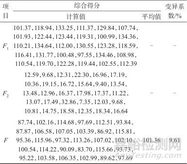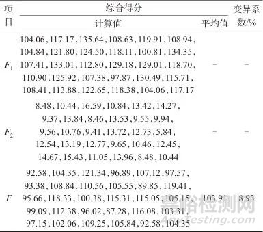 由式(2)~式(4)計(jì)算得到主成分得分和綜合得分值見表9。由表9可知,基于主成分分析綜合得分F的變異系數(shù)為8.93%。