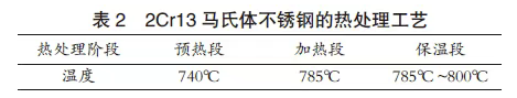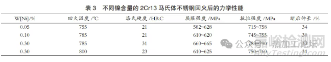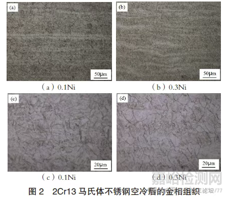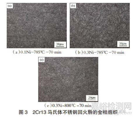 3)2Cr13馬氏體不銹鋼的力學(xué)性能可以通過回火工藝進(jìn)行調(diào)整,為了滿足訂單要求,需將鎳含量為0.3%的馬氏體不銹鋼回火溫度和保溫時間調(diào)整為800℃、70min,其力學(xué)性能與0.1Ni含量馬氏體不銹鋼的力學(xué)性能相當(dāng)。