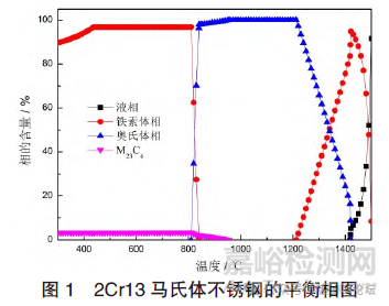 圖1所示為采用JMatPro軟件進(jìn)行計算得到的2Cr13馬氏體不銹鋼的平衡相圖,可見單相奧氏體相區(qū)的溫度范圍為955~1212℃,高于此溫度范圍會有鐵素體形成,而低于此溫度范圍會有M23C6產(chǎn)生。